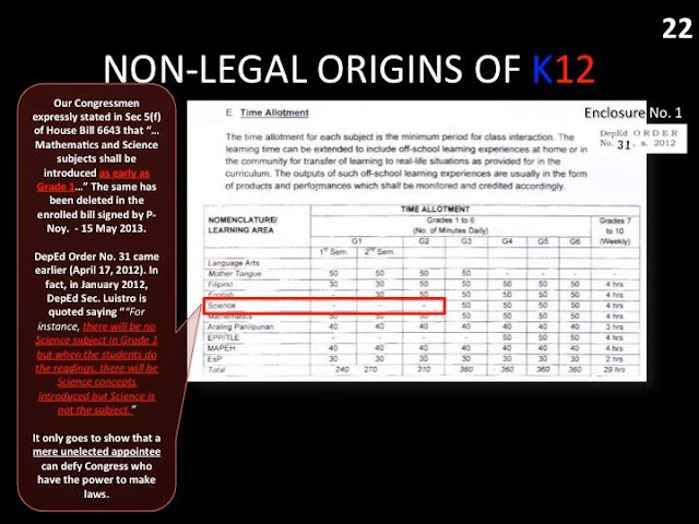 The law was signed on May 2013, but new high school curriculum was ordered to be implemented on April 2012, a year before the bill became law. As a result, students who finished 10th grade this year are no longer allowed to enter college without going through two additional years of basic education. Of course, there are objections to the law that go beyond discrepancies between versions. The law after all makes the serious mistake of equating K to 12 with compulsory education. Most countries have ten or even less years of compulsory education. The Philippine Constitution mandates only the six years of elementary education as compulsory. Republic Act 10533, DepEd's K to 12 curriculum, therefore amends the Philippine constitution.